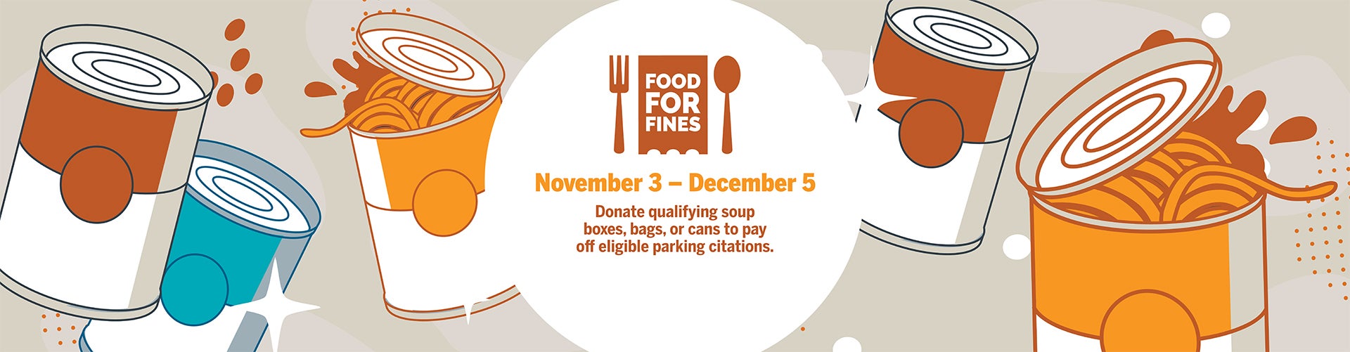 Food For Fines (November 3 - December 5): Donate qualifying soup boxes, bags, or cans to pay off eligible parking citations.
